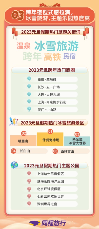 1月2日,同程旅行发布《2023年元旦假期旅行消费数据报告》。在近期释放的多重政策利好之下,元旦旅游市场快速回暖,机票、酒店较2020年元旦假期实现“量价齐升”。洛阳、哈尔滨、西双版纳等部分热门目的地在摆脱疫情影响后,酒店预订量同比上涨超过10倍。冰雪旅游和主题乐园都是人们元旦跨年旅游出行的热门玩法。元旦当天凌晨,城市的年轻人们还聚集在解放碑、五一广场等各大商圈,开启仪式感满满的新年。