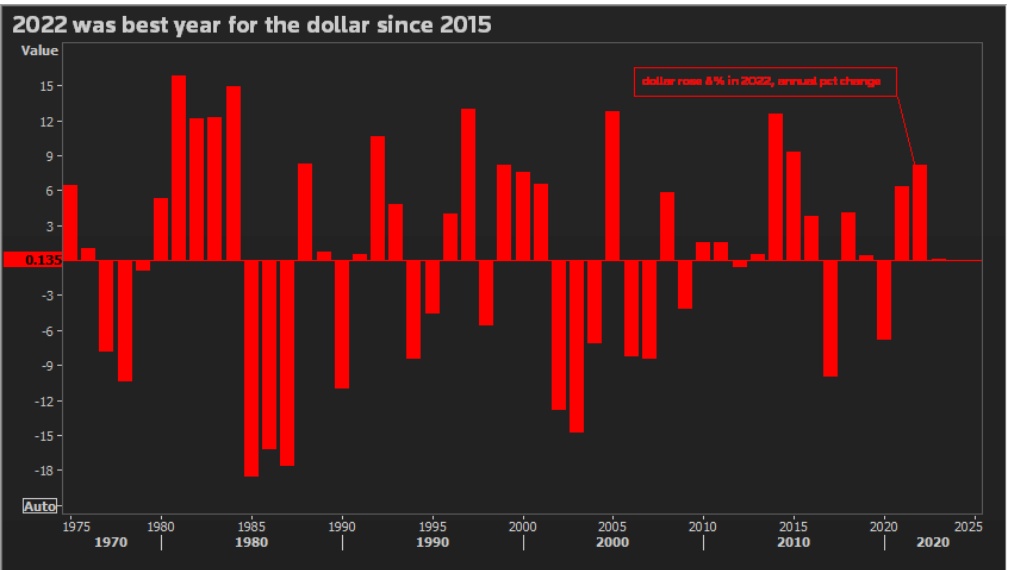自去年3月以来,美联储已累计加息425个基点,以遏制通胀飙升,但目前已开始放慢加息步伐。美联储的紧缩政策帮助美元指数去年上涨8%,创下2015年以来的最大年度涨幅。