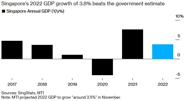 智通财经APP获悉,新加坡的经济复苏在2022年得以维持,相对强劲的年终表现使其在今年全球经济放缓的预期之前对经济提供支撑。据新加坡贸易与工业部周二预估,2022年新加坡国内生产总值(GDP)同比增长3.8%,略高于此前预测的3.5%。
