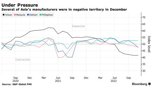 马来西亚12月PMI从47.9降至47.8,为2021年8月以来的最低水平。台湾12月制造业采购经理人指数(PMI)从上月的41.6小幅升至44.6,显示持续低迷的经济有所缓解。即便如此,该指数仍连续7个月处于收缩状态。