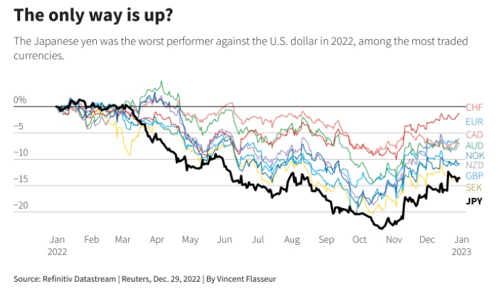 由于美联储大举加息,衡量美元兑主要货币表现的美元指数在2022年1月至11月上涨了15%以上。