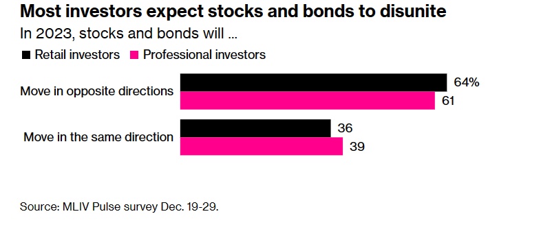 智通财经APP获悉,在通胀已经见顶的相对乐观情绪中,接受MLIV Pulse最新调查的610名受访投资者中有超过60%的人押注股票和债券今年将呈现反向走势(预计债市优于股市)。在过去20年中,这种相对反向的关系一直为养老金和其他的基金提供动力。在经历了全球金融危机以来60/40投资策略组合的最大损失之后,这个价值约万亿美元的平衡投资策略综合体今年可能略有复苏迹象,但是股债可能迈向相反方向。