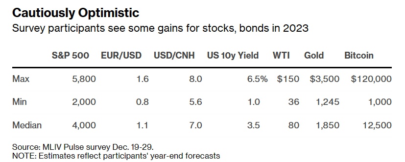谨慎乐观——调查参与者普遍认为2023年股票和债券温和上涨,原油小幅下滑