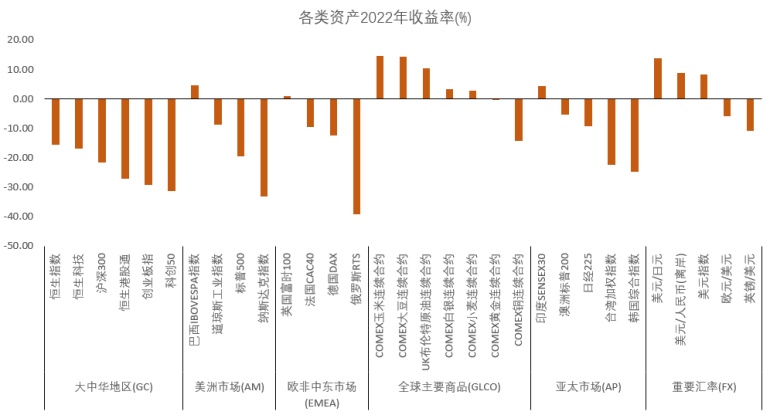 在过去的2022年,权益类市场表现低迷,除巴西等资源输出国的股市有所增长外,无论是欧美等发达市场,还是以中国为代表的新兴市场,均出现较深的跌幅。2022年从一季度末开始,由于欧美经济面临着较为严峻的通货膨胀,为应对疫情扰动实施的量化宽松政策有必要结束使命,退出历史舞台。对欧美资本市场来说,流动性的收紧,首先意味着估值的下行。对偏向于成长风格的股票来说,更是首当其冲。无论是美国市场的纳斯达克指数,还是中国的科创50指数、香港的恒生科技指数,由于成长股居多,2022年的调整幅度也较深。反观大宗市场,由于地缘政治冲突和粮食危机的影响,大多数农产品和石油等均有不错的涨幅。
