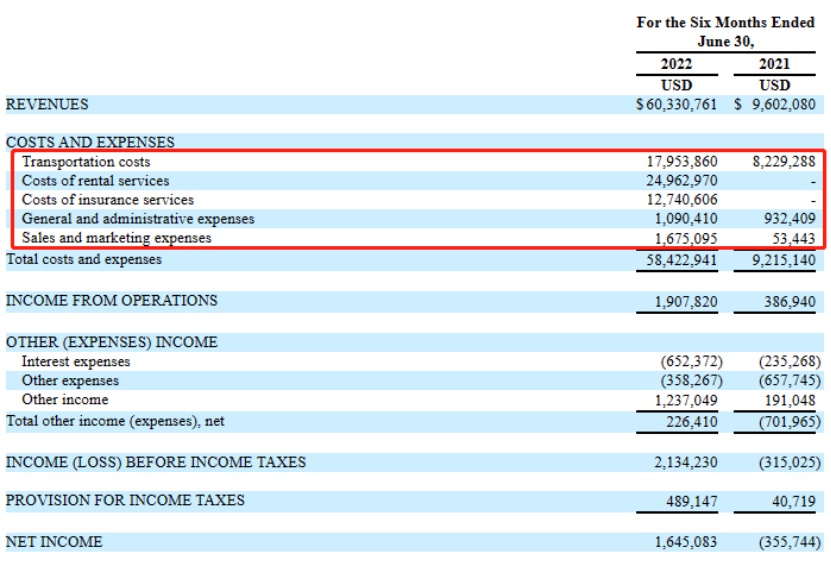 可以看到,2021年上半年明珠货运的费用明细呈现出的便是典型传统货运体系下的费用特征。但在2022年,明珠货运的费用端中除了交通费用、管理和销售费用外,新增了租赁服务费用和保险服务费用,甚至租赁服务费用达到2496.3万美元,超过交通费用成为明珠货运费用构成中占比最大的一环。