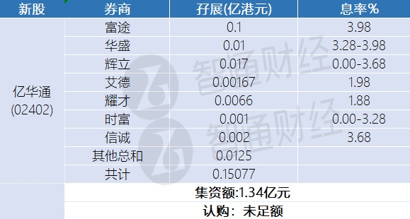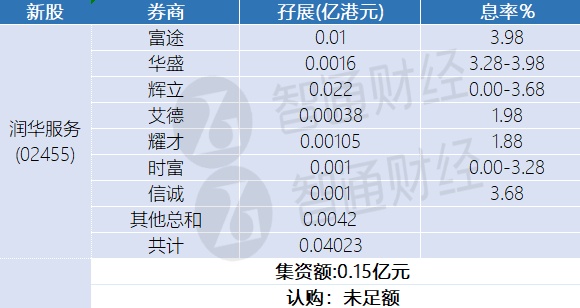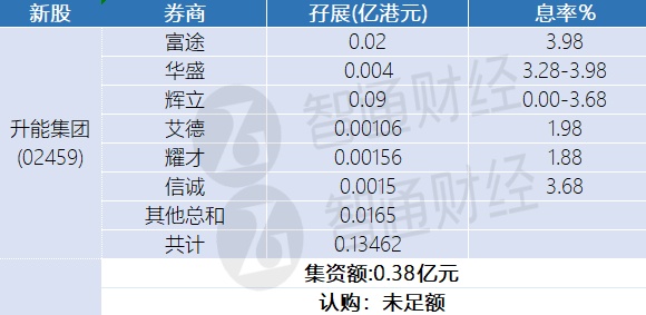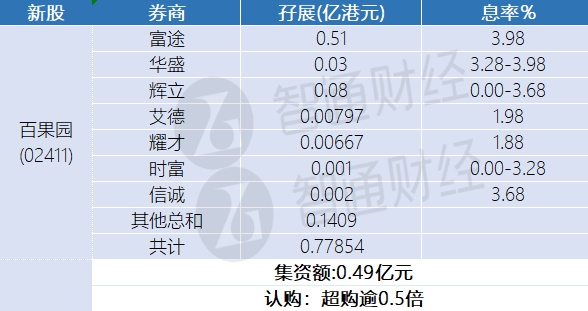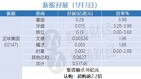 智通财经APP获悉,正味集团(02147)、望尘科技(02458)、百果园(02411)、亿华通(02402)、淮北绿金(02450)、润华服务(02455)、升能集团(02459)正在招股中。截至1月3日,辉立、华盛等合计为正味集团借出孖展0.51746亿港元,超购逾2.2倍;合计为望尘科技借出孖展0.62187亿港元,超购逾1.3倍;合计为百果园借出孖展0.77854亿港元,超购逾0.5倍;合计为亿华通、淮北绿金、润华服务、升能集团借出孖展0.15077亿港元、0.06328亿港元、0.04023亿港元、0.13462亿港元,认购均未足额。