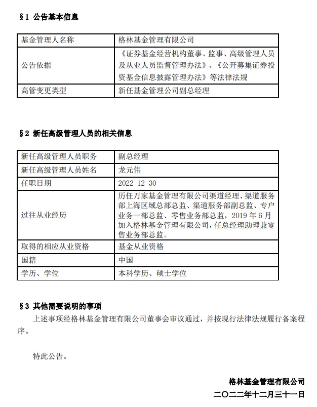 智通财经APP获悉,2022年12月31日,格林基金公告称,龙元伟于2022年12月30日新任公司副总经理一职。公开资料显示,龙元伟历任万家基金管理有限公司渠道经理、渠道服务部上海区域总部总监、渠道服务部副总监、专户业务一部总监、零售业务部总监,2019年6月加入格林基金管理有限公司,任总经理助理兼零售业务部总监。