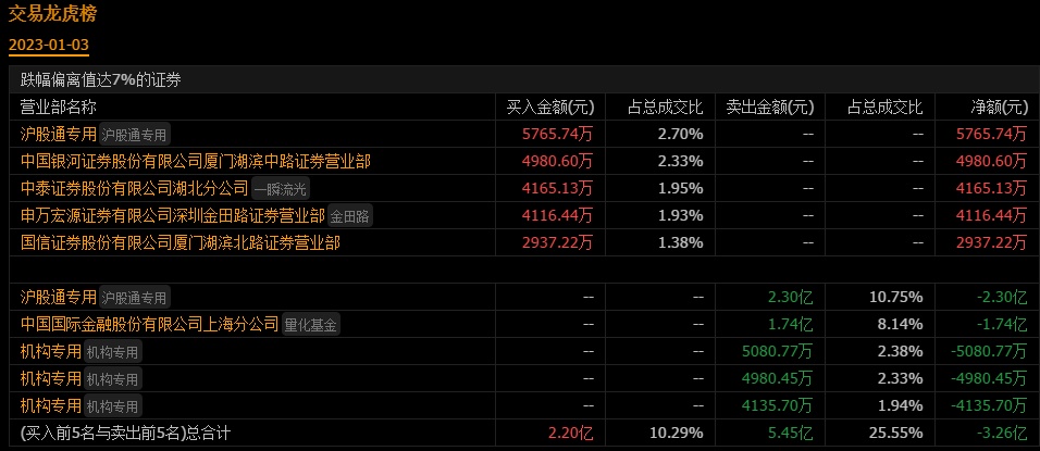 智通财经APP获悉,1月3日,2023年A股第一个交易日迎来开门红,而作为牛市旗手的券商板块却逆势走弱。华泰证券(601688.SH)领跌板块,早盘一度跌超8%,截至收盘报11.89元,收跌6.67%,全天成交金额21.3亿元,换手率2.47%。盘后龙虎榜数据显示,沪股通卖出2.3亿元并买入5765万元,三机构合计卖出1.42亿元,中金公司上海分卖出1.74亿元。