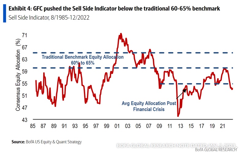 根据美国银行的报告,传统上,平衡基金的“正常”股票配置是60-65%。该报告强调,2008年金融危机使卖方指标“自2000年以来首次低于这一范围”。