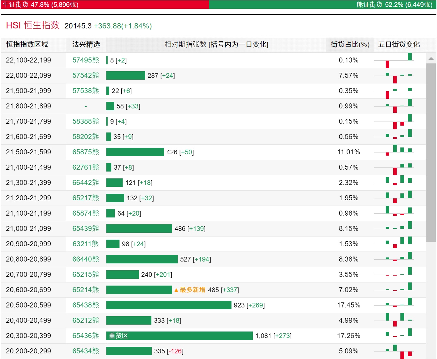 法兴恒指牛熊证街货分布图中的数据显示,熊证街货重货区在20300-20399区间,该区间最新熊证数量为1081张,较上一交易日增加273张;最多新增在20600-20699区间,该区间最新熊证数量为485张,较上一交易日增加337张。