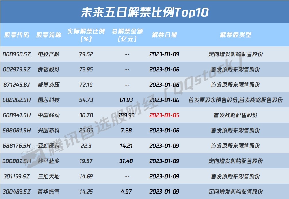 从解禁比例来看,未来五日电投产融解禁比例达79.52%,其次解禁比例居前的分别为侨银股份和威博液压;从解禁市值来看,中国移动、电投产融、国芯科技等股解禁市值居前。