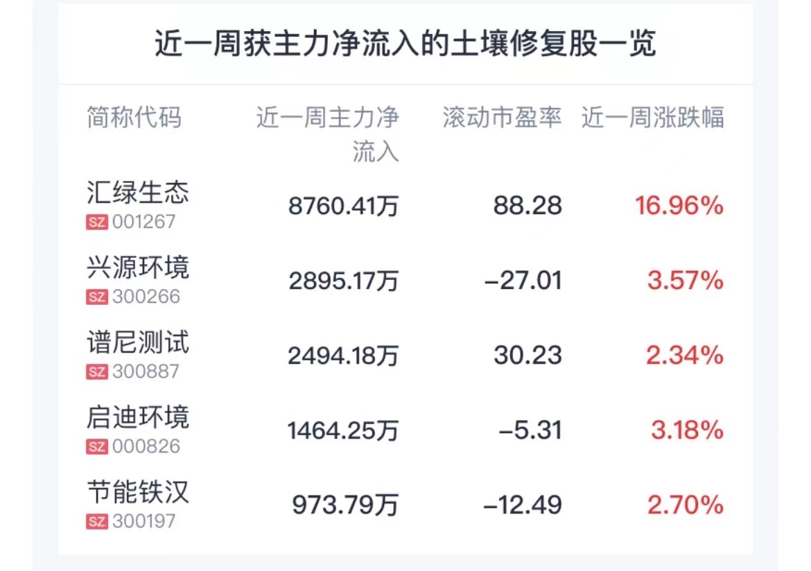 腾讯自选股统计了近一周主力资金净流入靠前的土壤修复概念股,仅供读者参考。数据显示,近一周汇绿生态获主力资金净流入8760万元居首,其次的兴源环境、谱尼测试均获主力净流入超2千万元。