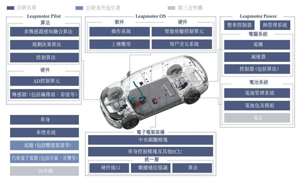 目前看来,零跑汽车倡导的“全域自研”打法可能会给出答案。据零跑汽车招股书显示,零跑的电芯和内外饰是外购,其他的算法、软硬件、电子电气架构等都是自研,绝大部分是自研自产。
