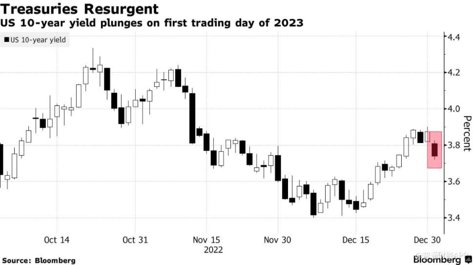 投资者也在2023年的第一个交易日抢购美国国债,因为他们押注现在由杰罗姆·鲍威尔领导的美联储将进一步放缓加息的步伐。随着通胀显示出放缓迹象以及对今年美国经济衰退的担忧加剧,市场对美联储加息的预期有所回落。