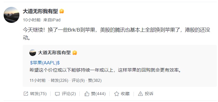对于苹果及腾讯这两家公司,段永平曾转发网友留言“公司赚的钱最终会买自己的。投资者信心是公司以外的事情,不应该考虑”,并回复称“看看苹果就明白了”。