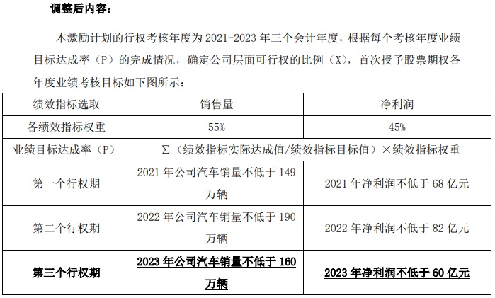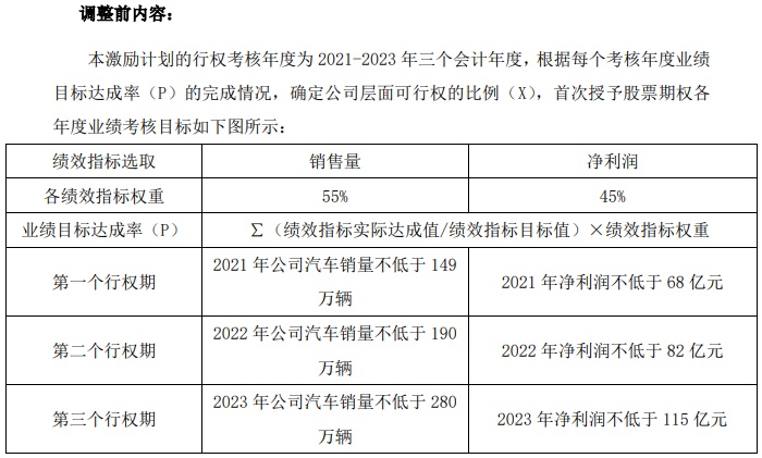 对于本次调整的原因,长城汽车方面表示,当前经营环境与公司在制定2021年限制性股票及股票期权激励计划时发生重大变化,尤其是中国新能源汽车渗透率实现快速突破,新能源汽车市场竞争格局发生较大变化,该重大变化是公司在制定2021年限制性股票激励计划及股票期权激励计划中不可提前预知的因素,与当时公司考虑的市场和行业环境存在重大差异,原限制性股票及股票期权激励计划所设定的业绩考核指标已不能和公司当前所处的市场和行业环境相匹配。
