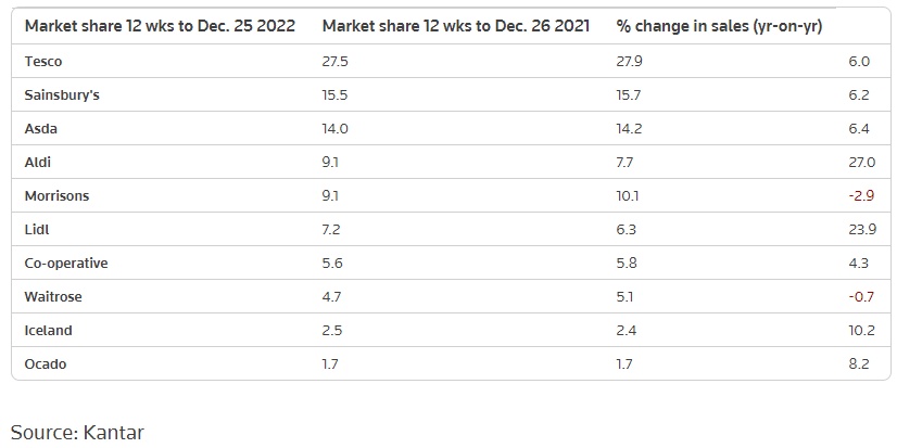 市场巨头Tesco(TSCDF.US)、Sainsbury’s和Asda均表现强劲,截至12月25日的12周内销售额分别增长了6.0%、6.2%和6.4%。