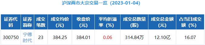 根据本次大宗交易的交易明细显示,宁德时代出现23笔共计12.1亿元大宗交易,成交价多为收盘价384.01元,另有3笔成交价386.5元,2笔成交为384.31元,卖方全部为机构席位。截至1月4日收盘,宁德时代收384.01元,下跌1.44%,全天成交额75.3亿元,换手率0.94%。大宗交易成交金额占当日成交金额16.07%,溢价0.06%。