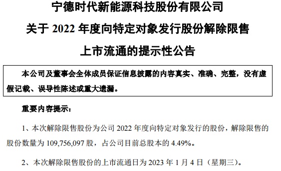 消息上,据宁德时代12月29日公告披露,1月4日,宁德时代将有部分限售股迎来超400亿的巨额解禁。本次解除限售的股份数量约为1.1亿股,占公司目前总股本的4.49%。