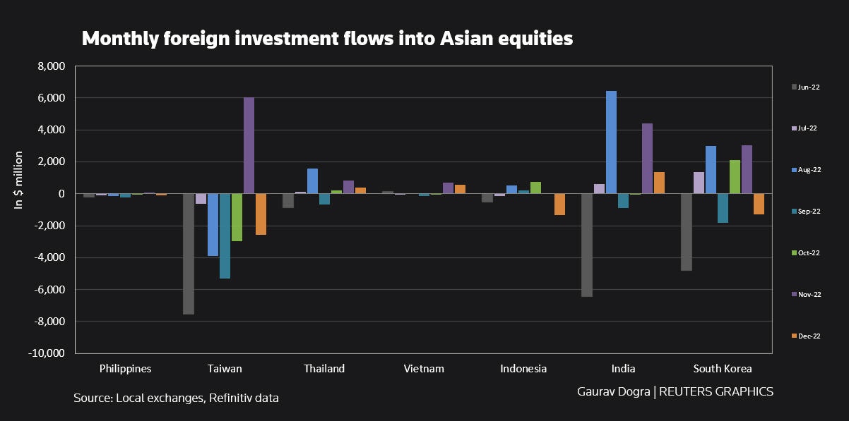 去年12月,除日本外,亚洲新兴市场股票净抛售额达30亿美元,中国台湾、印度尼西亚和韩国市场的股市分别遭遇25.5亿美元、13.4亿美元和13.1亿美元的资金流出。