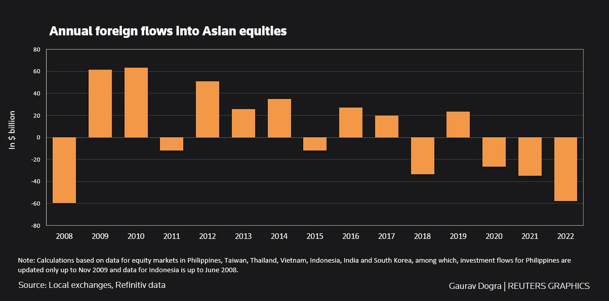 智通财经APP获悉,海外市场投资者于2022年从亚洲新兴市场撤出的资金比2008年全球金融危机以来的任何一年都多,主要由于美国利率的持续上升导致资金流向美元避险资产。来自中国台湾、印度、菲律宾、越南、泰国、印度尼西亚和韩国的证券交易所数据显示,去年这些地区的交易所境外用户出售了价值约570亿美元的股票,为自2008年以来最大的一次资金外流。