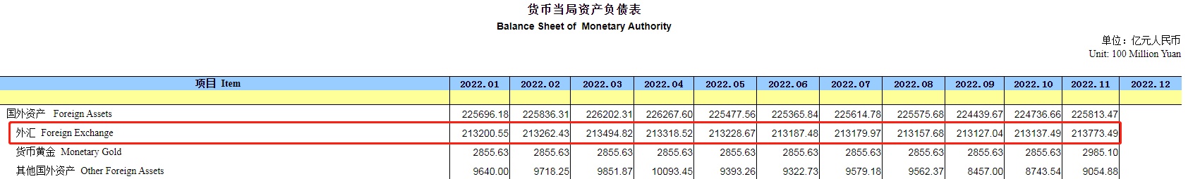 智通财经APP获悉,1月4日消息,中国人民银行公布的资产负债表数据显示,11月末央行外汇占款为213773.49亿元人民币,环比10月的213137.49亿元,增加636亿元人民币。
