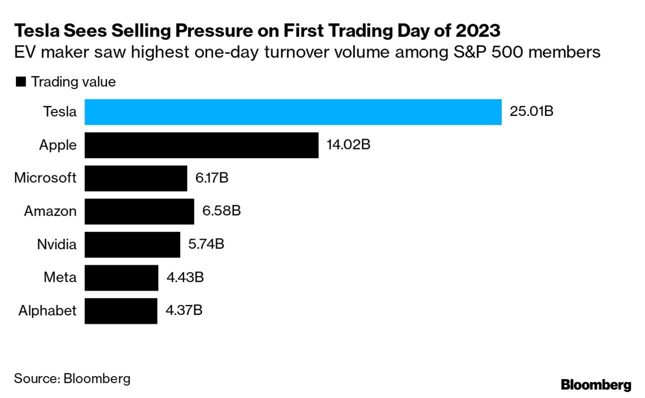 特斯拉在2023年第一个交易日遭遇抛售压力——单日交易规模在标普500指数成分股中最高