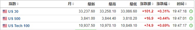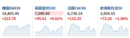 2. 截至发稿,德国DAX指数涨1.59%,英国富时100指数涨0.59%,法国CAC40指数涨1.75%,欧洲斯托克50指数涨1.86%。