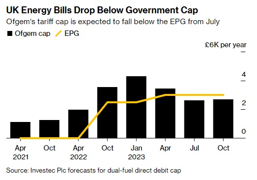 而到7月,英国能源监管机构Ofgem设定的能源价格上限将首次低于政府的能源价格保障措施(EPG),这将是政府自去年10月推出EPG以来的首次。本季度迄今为止相对温和的天气导致电力和天然气需求低于预期,这减轻了首相苏纳克政府的负担,因为飙升的能源成本助长了历史性的通货膨胀。