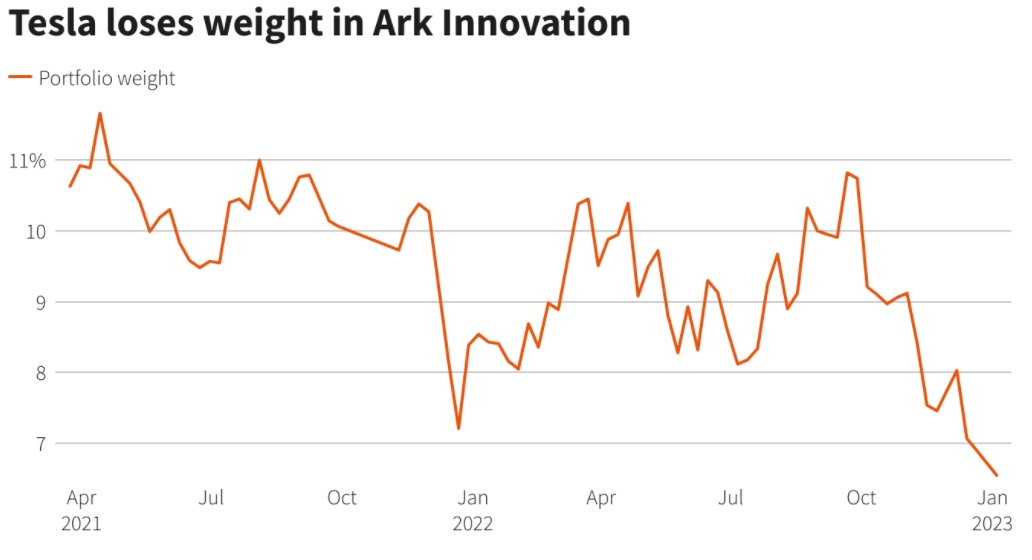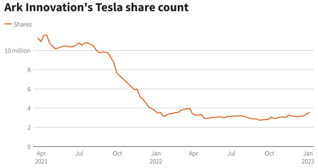 不过,到目前为止,几乎没有迹象表明特斯拉最大的支持者正在失去信心。根据特斯拉网站的数据,明星选股人“木头姐”凯西·伍德(Cathie Wood)旗下基金ARK Innovation ETF在周二的抛售中买入了144,776股特斯拉股票,使特斯拉在59亿美元资产中的持股达到约6.5%。该基金去年下跌67%,在所有美国股票基金中几乎垫底。