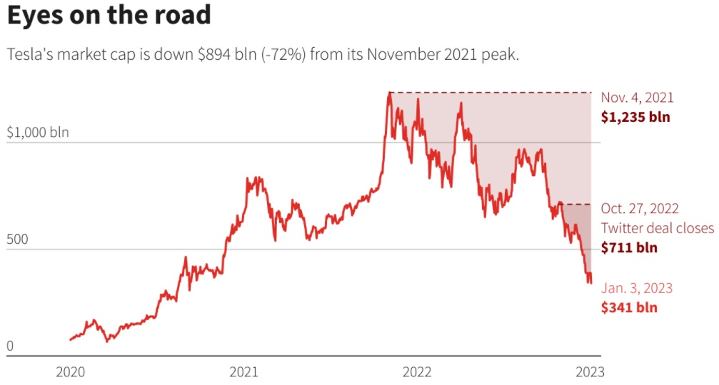 特斯拉去年下跌了约65%,在马斯克决定收购社交媒体网络推特后,跌幅加速,一些投资者认为推特分散了马斯克的精力。