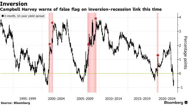 Campbell Harvey周二表示:“我的收益率曲线已经亮起‘红色信号’,它成功预测了自1968年以来的全部8次衰退。然而,我有理由相信,这一次它是在发出错误的信号。”