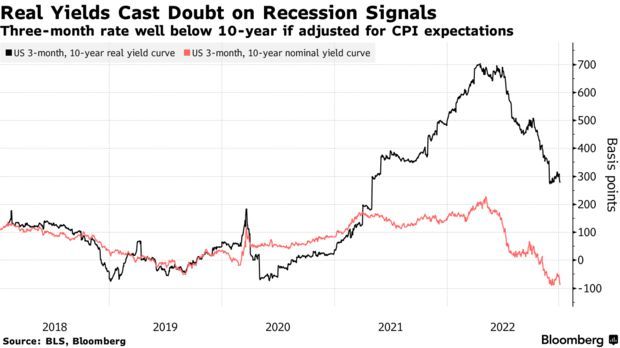 Campbell Harvey的模型与经通胀调整后的收益率有关。他表示,交易员认为价格压力会随着时间的推移而缓解,这也降低了未来出现衰退的可能性。“当你把所有这些因素放在一起时,它表明我们可以‘躲开子弹’,避免经济硬着陆,实现缓慢增长或小幅负增长。如果出现衰退,也将是温和的。”