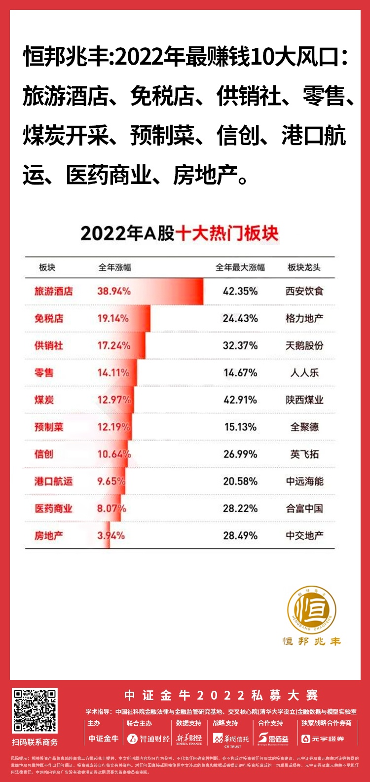 智通财经APP获悉,由元宇证券独家战略支持的中证金牛2022私募大赛于12月1日正式启动,赛事正如火如荼开展。近期不少参赛机构研究团队及产品主理人就市场走势和行业展望发表真知灼见。深圳市恒邦兆丰私募证券基金管理有限公司指出,2022年A股十大热门板块分别是旅游酒店、免税店、供销社、零售、煤炭开采、预制菜、信创、港口航运、医药商业、房地产。