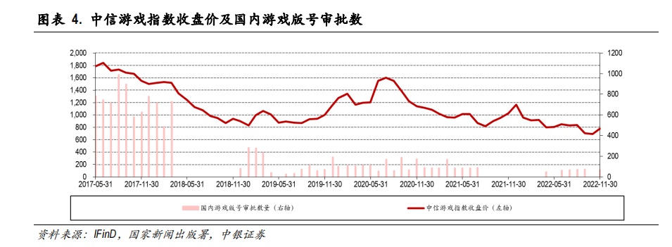 前有伽马数据发布报告指出,游戏行业10月收入环比增速已经转正,这是半年来首次出现的良好现象;2022年未成年人游戏时长与充值双降,游戏沉迷问题进一步解决。后有央媒发文,对游戏行业价值给予正向评价。此外,12月28日,国家新闻出版署发布12月国产网络游戏审批信息,有84款国产游戏获批,年内获批的游戏数量已达468款,进一步表明游戏行业呈回暖之势。