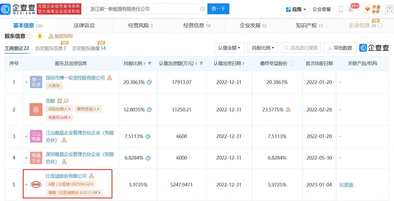 智通财经APP获悉,企查查APP显示,近日,浙江碳一新能源有限责任公司(下称:碳一新能源)发生工商变更,股东新增比亚迪股份有限公司、深圳市创启开盈商务咨询合伙企业(有限合伙)、宜宾绿能股权投资合伙企业(有限合伙)等;同时注册资本由约7.87亿人民币增至约8.79亿人民币。据公开资料显示,碳一新能源成立于2021年12月,法定代表人为陈远菲,经营范围含新兴能源技术研发;新材料技术研发;电池销售;电池制造。