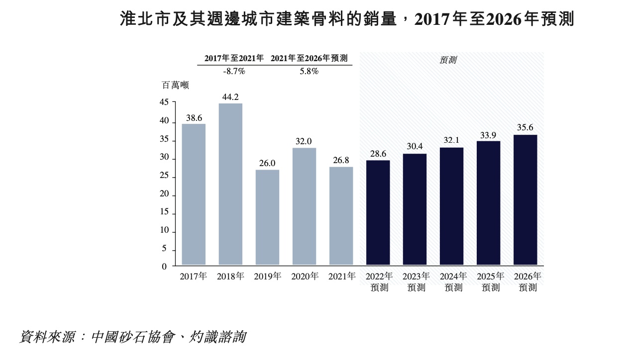 随着未来几年经济的发展预期,建筑活动将继续增加,淮北市及其周边城市的建筑骨料销量也将恢复旺盛需求。据灼识咨询预测,淮北市及其周边城市的建筑骨料销量预计将由2021年的2680万吨增加至2026年的3560万吨,复合年增长率约为5.8%。智通财经APP注意到,幸存下来的拥有采矿许可证及环保达标能力的采石场大多为国有企业,也正积极扩大产能以把握市场需求。