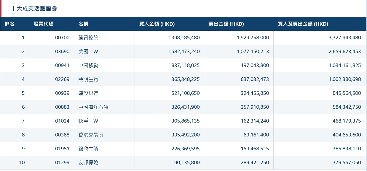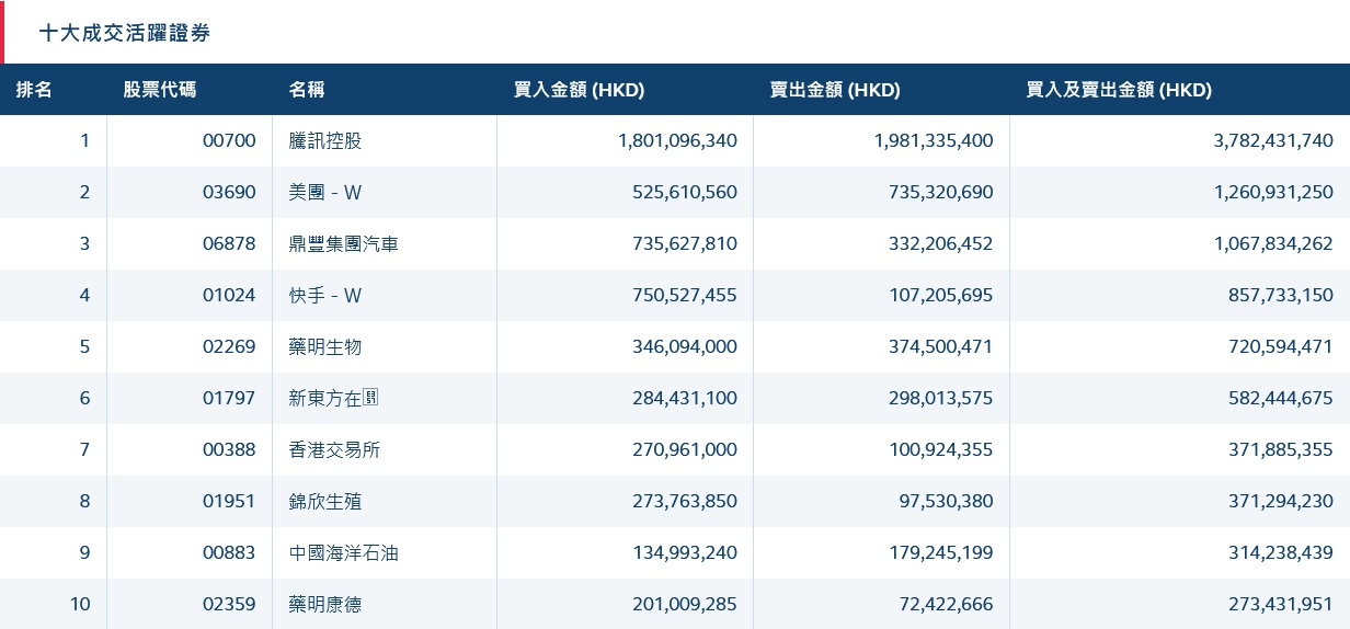 此外,美团-W(03690)、建设银行(00939)、中海油(00883)分别获净买入2.95亿、1.96亿、2426万港元。而腾讯(00700)、友邦保险(01299)分别遭净卖出7.11亿、1.99亿港元。