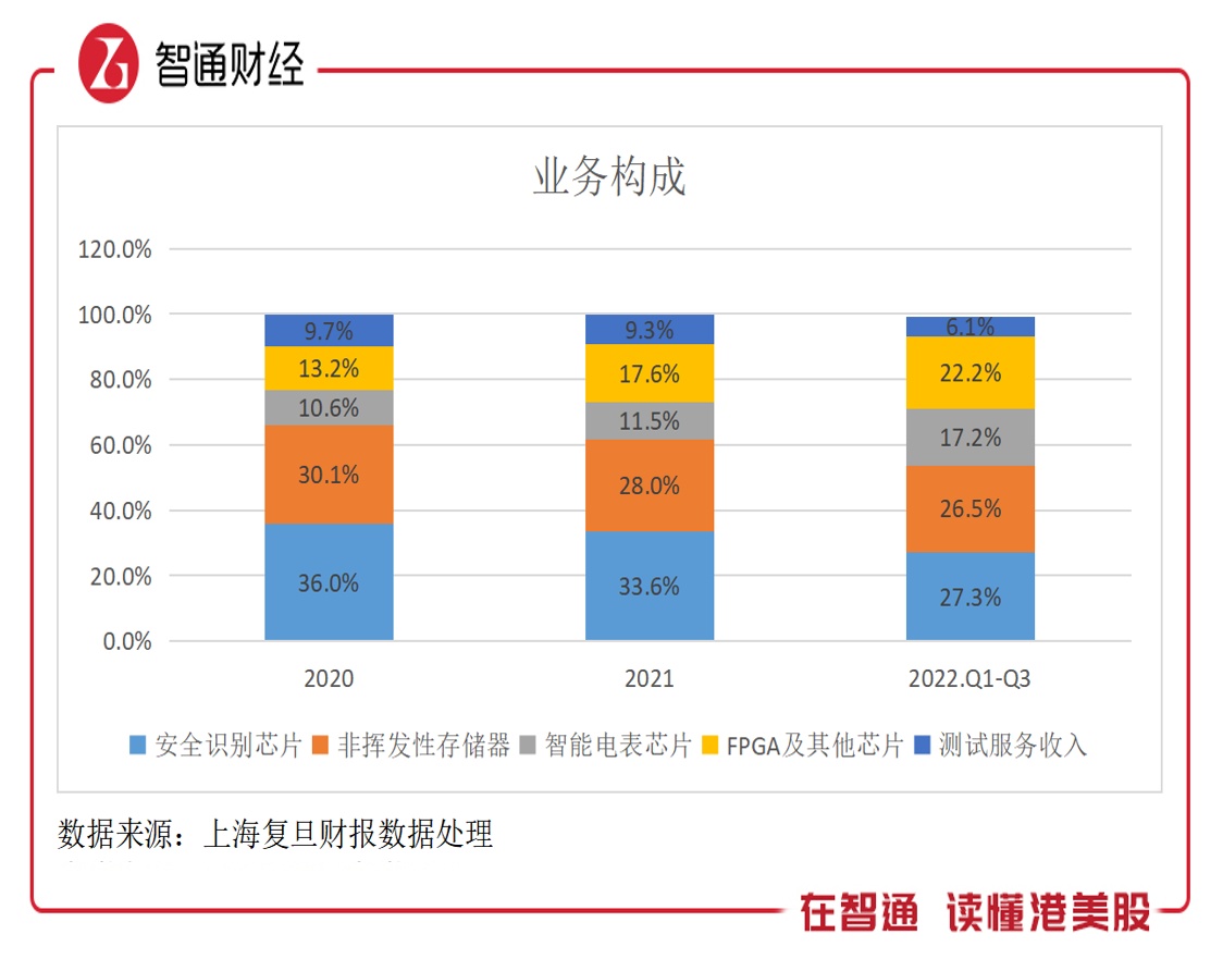 近几年,该公司产品构成变化显著,安全与识别芯片、非挥发存储器及测试服务收入贡献逐年走低,而智能电表芯片及FPGA芯片则恰恰相反,2022年首三季份额分别提升至17.2%及22.2%。不过从数据看,上述产品收入均是增长的,其中FPGA芯片增速最快,2021年及2022年增速基本翻倍。