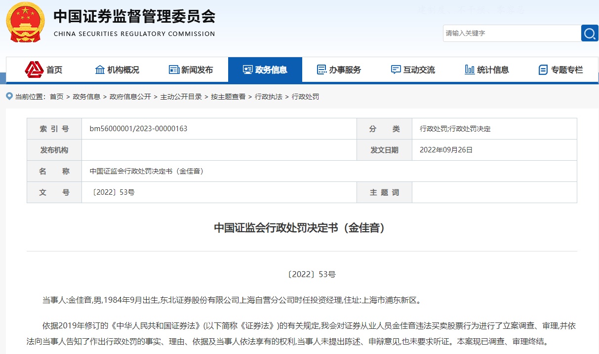 据处罚决定书显示,当事人金佳音,于1984年9月出生,2011年取得证券从业资格,2017年3月7日入职东北证券股份有限公司上海自营分公司,入职时担任研究经理,2017年4月24日至今,担任投资经理,管理公司自营账户。