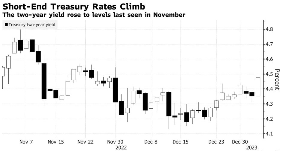 随着市场焦点转向美国劳动力市场的强劲程度,债券交易员对美联储加息的预期再次升温,推动短期美国国债收益率升至去年11月以来的水平。