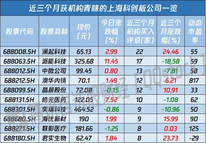 此外,腾讯自选股统计了近三个月获机构青睐的属于上海地域板块而且为科创板公司名单,仅供读者参考。数据显示,近三个月澜起科技获22家机构买入评级居首,其次的派能科技、中微公司、澳华内镜、晶晨股份、皓元医药均获机构买入评级超10家。