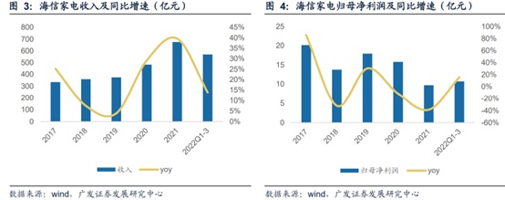 从财务角度来看,近年以来,公司总营收由2017年335亿元提升至2021年676亿元,不断增长,特别是2020、2021年连续两年营收呈现双位数高增长,主要为海信日立、日本三电相继并表贡献。盈利端方面却有所承压,受近年全球疫情影响,公司2020、2021年归母净利润分别同比降12%、下降38%,主要由于原材料价格高企、三电并表拖累(2021年表内亏损1.6亿元)。