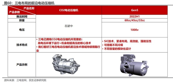 而产品及技术为三电长期核心竞争力,产品高速迭代下具备快速反应市场需求的能力。压缩机是三电的核心产品,2018年汽车压缩机市场份额全球第二。三电早在2009年已布局电动压缩机,目前迭代至第4代产品“Gen4”,具有高度集成化、大排量、高效率、高耐用性的特点,最高可在470V高压下运行,可适配高度集成化的整车热管理系统。
