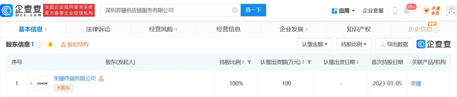 智通财经APP获悉,企查查APP显示,近日,深圳昇耀供应链服务有限公司成立。股东信息显示,该公司由荣耀终端有限公司全资控股。据公开资料显示,该公司成立于2023年1月,法定代表人为彭求恩,注册资本100万人民币,经营范围包括工程和技术研究和试验发展;供应链管理服务;国内货物运输代理;仓储服务;卫星移动通信终端制造等。