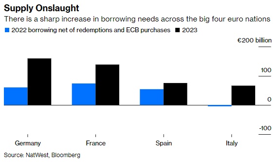 智通财经APP注意到,欧元区10个最大的国家今年预计将发行约1.3万亿欧元(1.38万亿美元)的主权债券。考虑到到期债务,其中一半多一点将是新增资金。国民西敏寺银行(NatWest Group Plc)的分析师表示,这是一个可怕的巨大增长,净新增供应量约为3400亿欧元。欧洲央行从3月开始的量化紧缩进程将增加至少1500亿欧元的债券市场,这将增加市场压力。