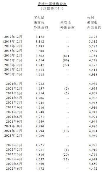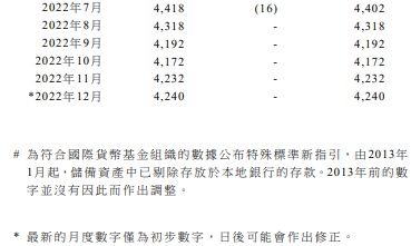 2022年12月底及11月底并无未交收外汇合约。为数4240亿美元的外汇储备资产总额,相当于香港流通货币5倍多,或港元货币供应M3约41%。