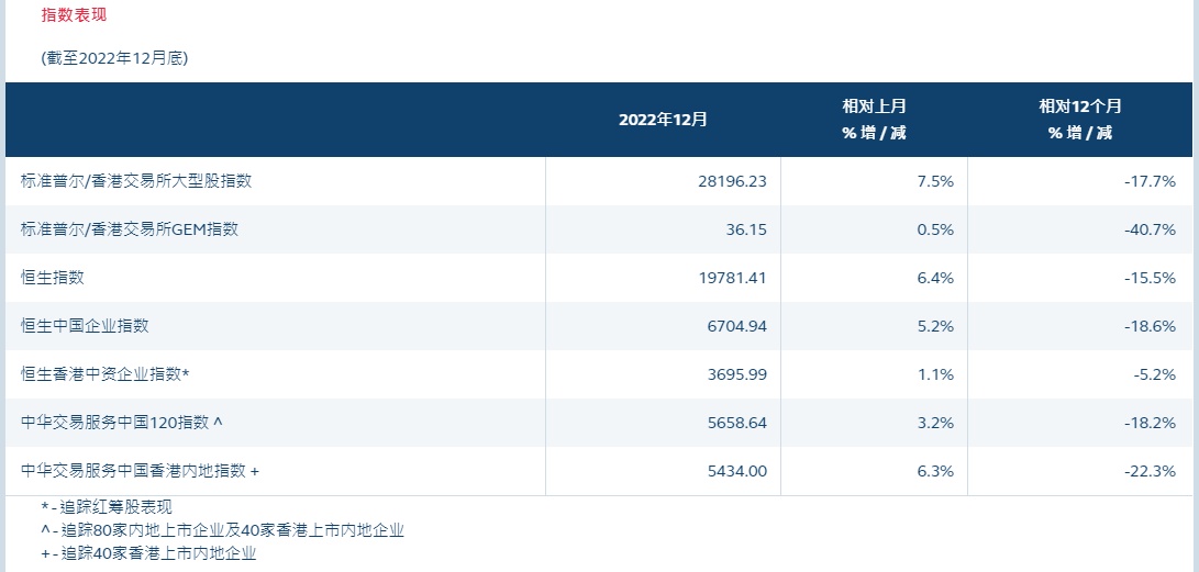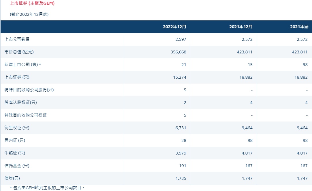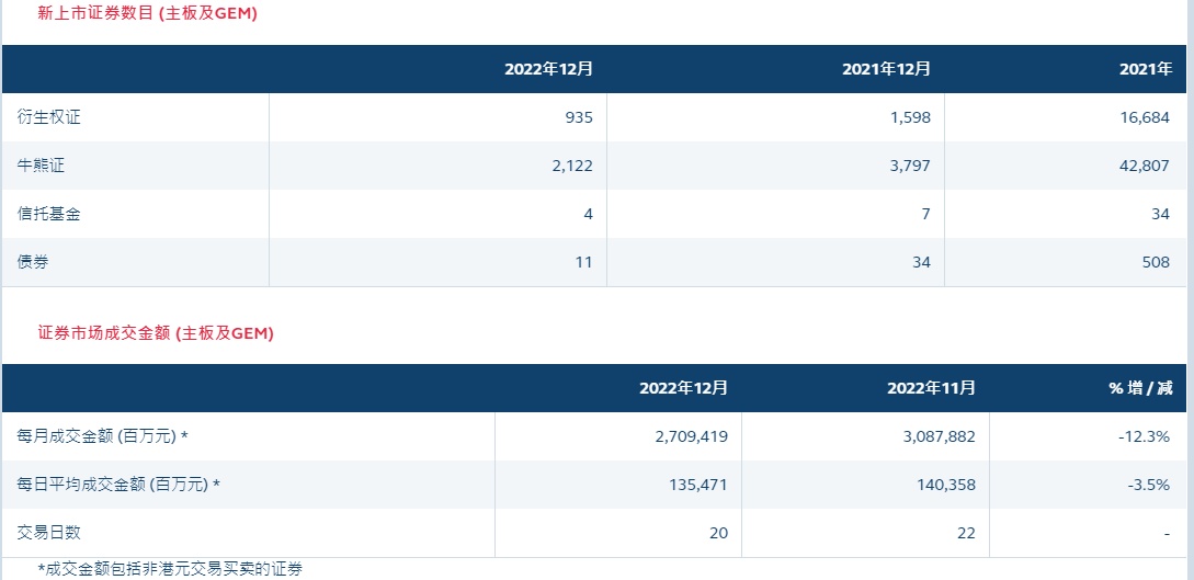 智通财经APP获悉,1月6日,港交所发布2022年12月市场概况。证券市场方面,证券市场市价总值于2022年12月底为35.7万亿港元,较上月底的33.3万亿港元上升7%,并较去年同期的42.4万亿港元下跌16%。2022年12月的平均每日成交金额为1,355亿港元,较去年同期的1,178亿港元上升15%。2022年的交易所买卖基金平均每日成交金额98亿港元,较2021年的66亿港元上升48%。2022年的杠杆及反向产品平均每日成交金额22亿港元,较2021年的11亿港元上升100%。2022年的债券平均每日成交金额为5.4亿港元,较2021年的4.2亿港元上升29%。