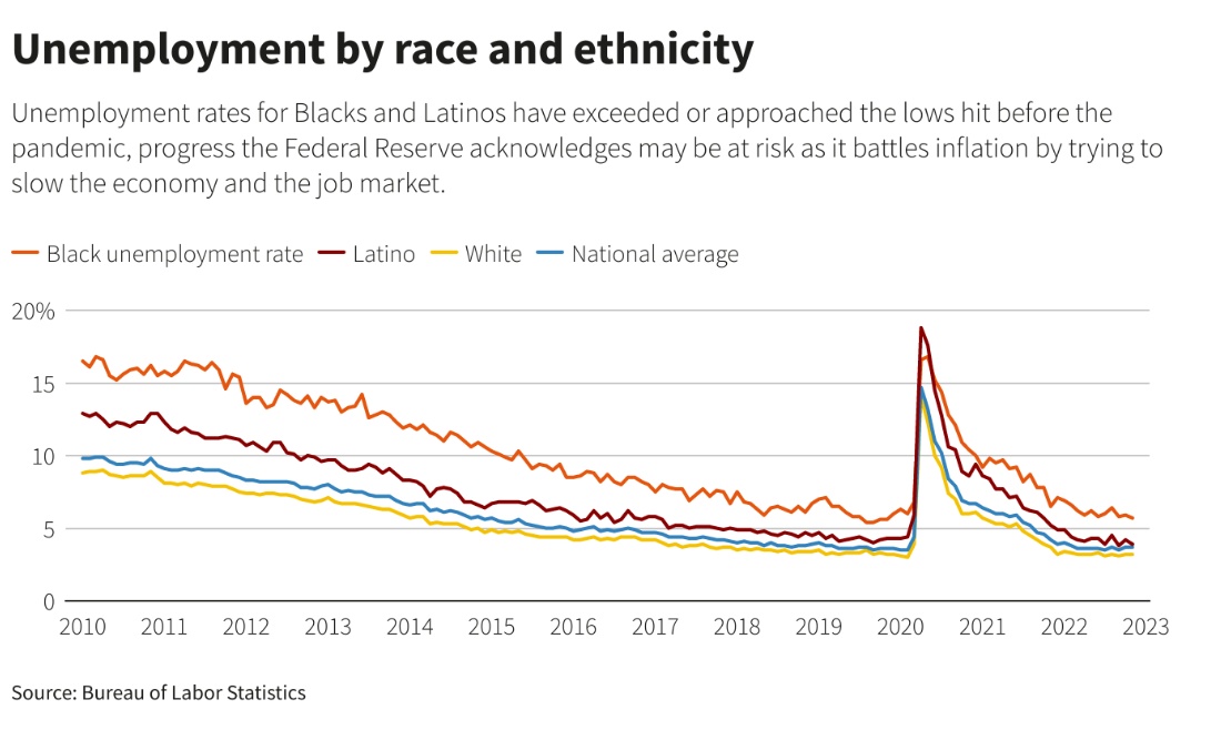 然而,在美国物价仍在急剧上涨的情况之下,美联储的这一承诺受到了来自通胀率的“降维打击”。美联储官员在12月13日至14日的政策会议上承认,遏制通货膨胀所需的经济放缓也意味着多数群体将面临失业率上升,在市场观察人士看来尤其集中在非洲裔和拉丁裔等少数族裔群体——这一群体的失业率可能会比全美平均水平上升得更多。
