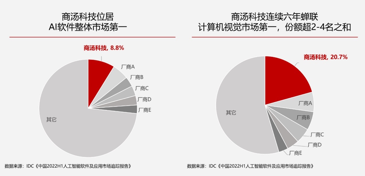 中国的AI软件市场中有3,000余家厂商。之前,IDC发布《2022上半年人工智能及软件市场追踪报告》指出,凭借“一平台四支柱”的战略布局,商汤科技(00020)位居市场第一,全面领跑AI软件赛道。